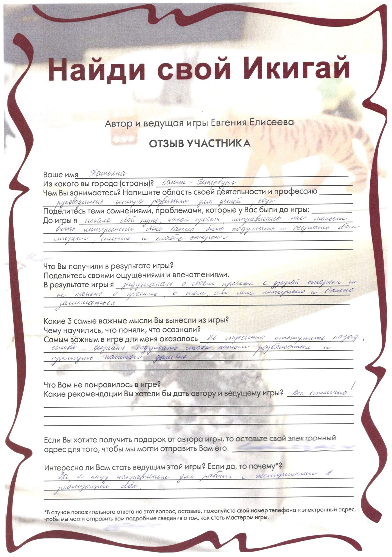 До игры я задумывалась о смене работы, карьерного пути и в результате получила много инсайтов, пищи для ума. Есть метафора моего Икигай, осталось перевести это в реальность.
